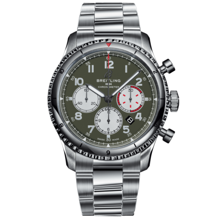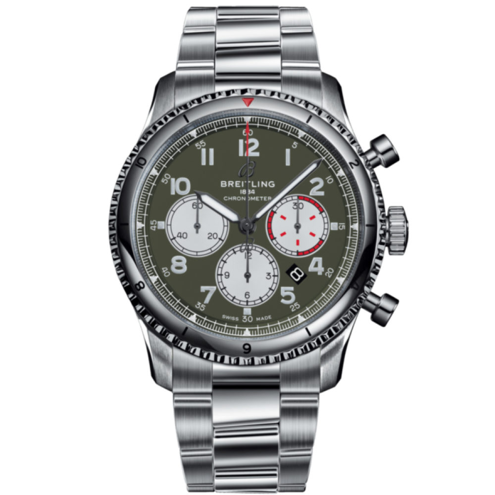 Breitling Aviator 8 B01 Chronograph 43 CURTISS WARHAWK AB01192A1L1A1 - men's watch produced by Breitling. It is equipped with Japanese automatic movement and Breitling Caliber 01 calibre. Stainless steel case of round shape. Case dimensions are 43 mm. in diameter. The dial of this Breitling watch is green. Display type: analog. This timepiece has sapphire, antireflection coating glass. Stainless steel band, band color: silver. 100 m. water resistance. The watch is from Aviator 8 collection. The following features are equipped: chronometer, glowing hands, glowing markers, chronograph, date, screw-down crown.