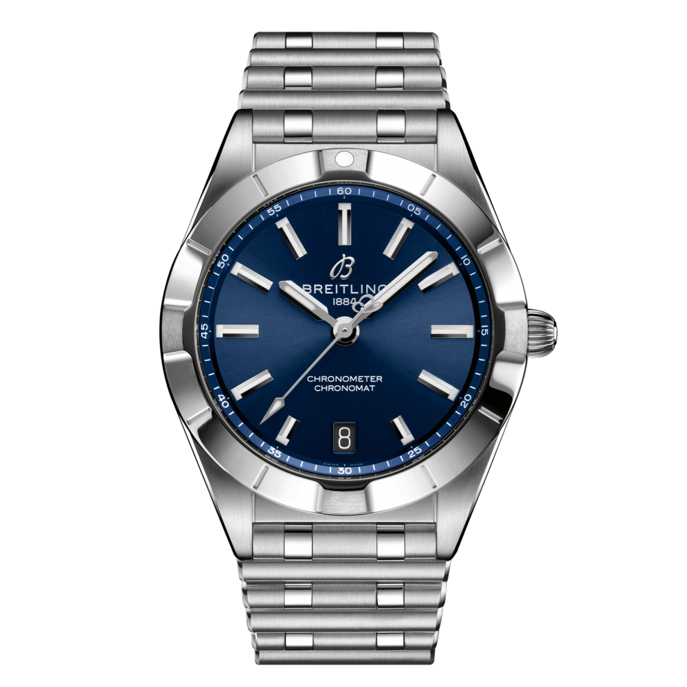 Breitling Chronomat 32 Quartz A77310101C1A1 - ladies watch manufactured by Breitling. It has Japanese quartz movement and Breitling Caliber 77 calibre. Stainless steel case of round shape. Case dimensions are 32 mm. in diameter and 8.5 mm. in thickness. The dial of this Breitling watch is blue. Display type: analog. This timepiece has sapphire, antireflection coating glass. Stainless steel band, band color: silver. 100 m. water resistance. The watch is from Chronomat collection. The following features are equipped: date, chronometer, glowing hands, glowing markers.