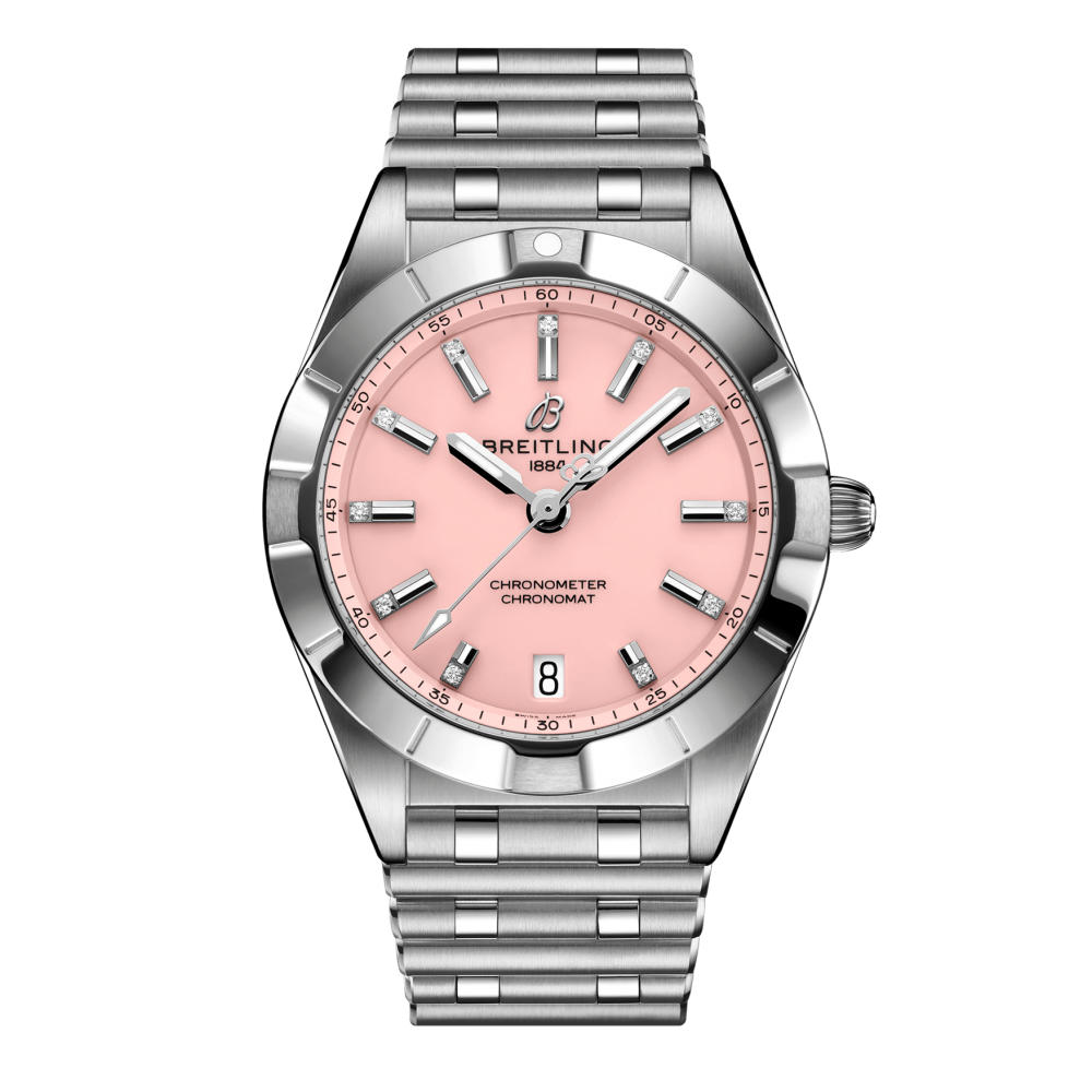 Breitling Chronomat 32 Quartz A77310101K1A1 - ladies watch made by Breitling. It has Japanese quartz movement and Breitling Caliber 77 calibre. Stainless steel case of round shape. Case dimensions are 32 mm. in diameter and 8.5 mm. in thickness. The dial of this Breitling watch is pink. Display type: analog. This timepiece has sapphire, antireflection coating glass. Stainless steel band, band color: silver. 100 m. water resistance. The watch is from Chronomat collection. The following features are equipped: date, chronometer, glowing hands, glowing markers, diamond set.
