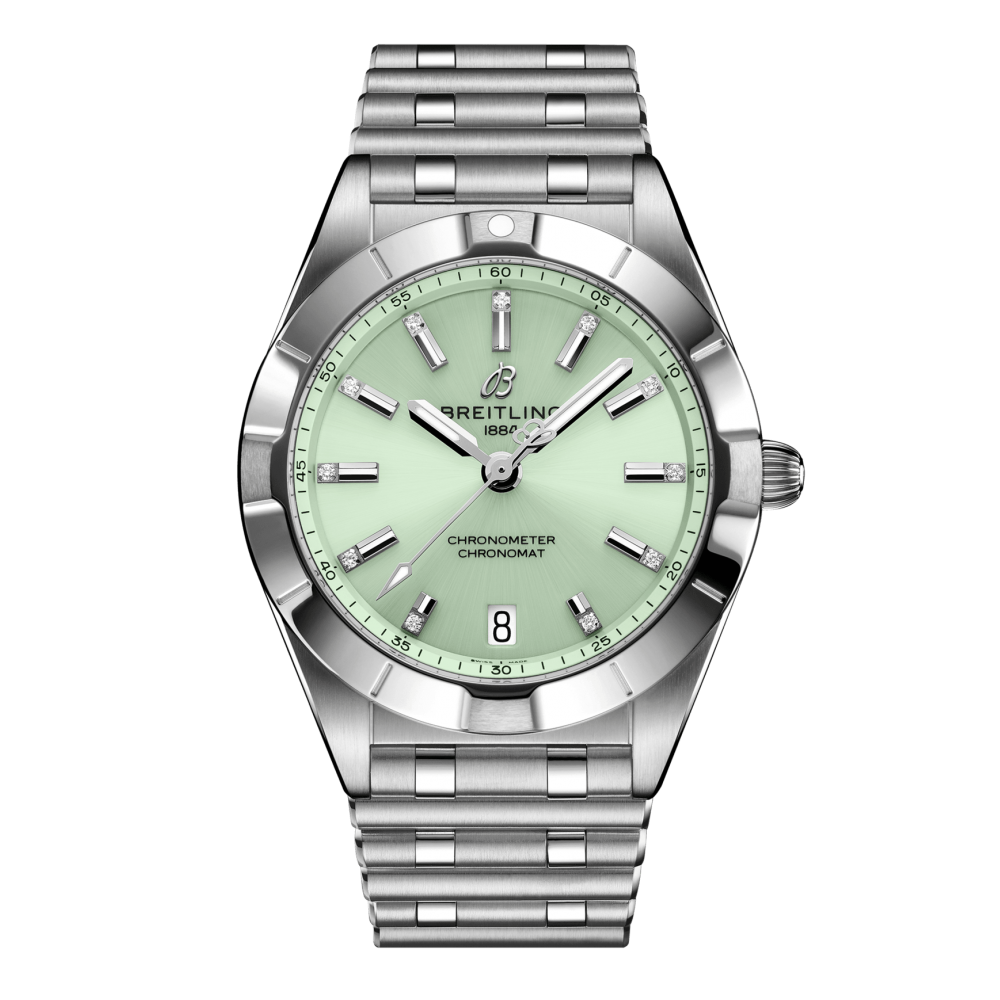 Breitling Chronomat 32 Quartz A77310101L1A1 - ladies watch manufactured by Breitling. It is equipped with Japanese quartz movement and Breitling Caliber 77 calibre. Stainless steel case of round shape. Case dimensions are 32 mm. in diameter and 8.5 mm. in thickness. The dial of this Breitling watch is green. Display type: analog. This timepiece has sapphire, antireflection coating glass. Stainless steel band, band color: silver. 100 m. water resistance. The watch is from Chronomat collection. The following features are equipped: date, chronometer, glowing hands, glowing markers, diamond set.