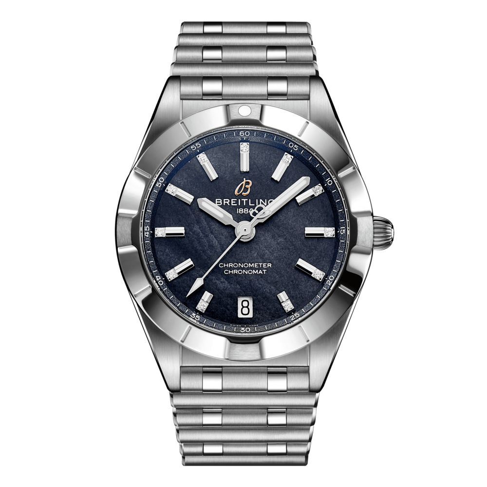 Breitling Chronomat 32 Quartz Japan Edition A77310101B1A1 - ladies watch produced by Breitling. It is equipped with Japanese quartz movement and Breitling Caliber 77 calibre. Stainless steel case of round shape. Case dimensions are 32 mm. in diameter and 8.5 mm. in thickness. The dial of this Breitling watch is mother of pearl, black. Display type: analog. This timepiece has sapphire, antireflection coating glass. Stainless steel band, band color: silver. 100 m. water resistance. The watch is from Chronomat collection. The following features are equipped: date, chronometer, glowing hands, glowing markers, diamond set.