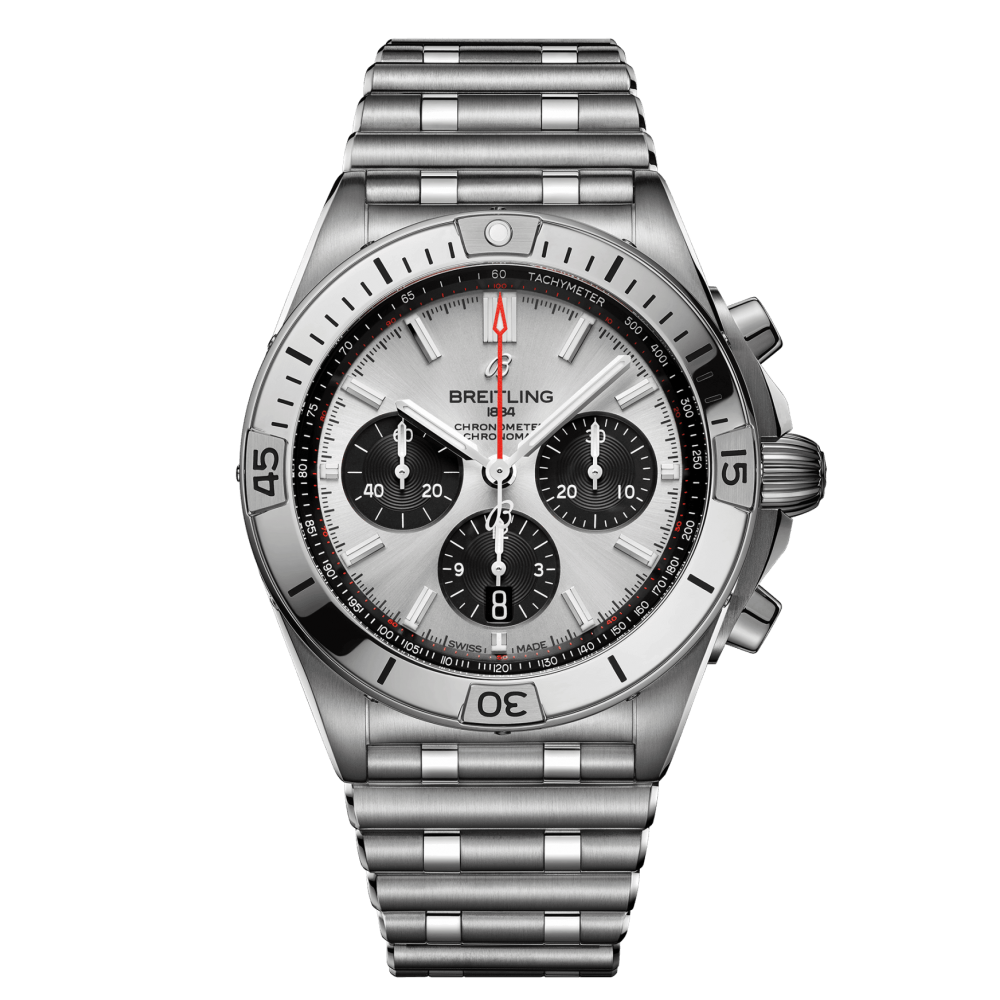 Breitling Chronomat B01 42 AB0134101G1A1 - men's watch produced by Breitling. It is equipped with Japanese automatic movement and Breitling Caliber 01 calibre. Stainless steel case of round shape. Case dimensions are 42 mm. in diameter and 15.1 mm. in thickness. The dial of this Breitling watch is silver. Display type: analog. This timepiece has sapphire, antireflection coating glass. Stainless steel band, band color: silver. 200 m. water resistance. The watch is from Chronomat collection. The following features are equipped: date, chronometer, glowing hands, glowing markers, chronograph, screw-down crown.