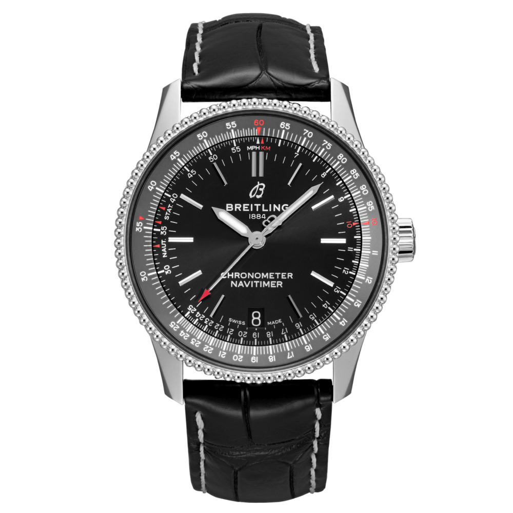 Breitling Navitimer Automatic 38 A17325241B1P1 - unisex watch made by Breitling. It has Japanese automatic movement and Breitling Caliber 17 calibre. Stainless steel case of round shape. Case dimensions are 38 mm. in diameter and 9.9 mm. in thickness. The dial of this Breitling watch is black. Display type: analog. This timepiece has sapphire glass. Alligator band, band color: black. 30 m. water resistance. The watch is from Navitimer collection. The following features are equipped: glowing hands, chronometer, slide rule, date.