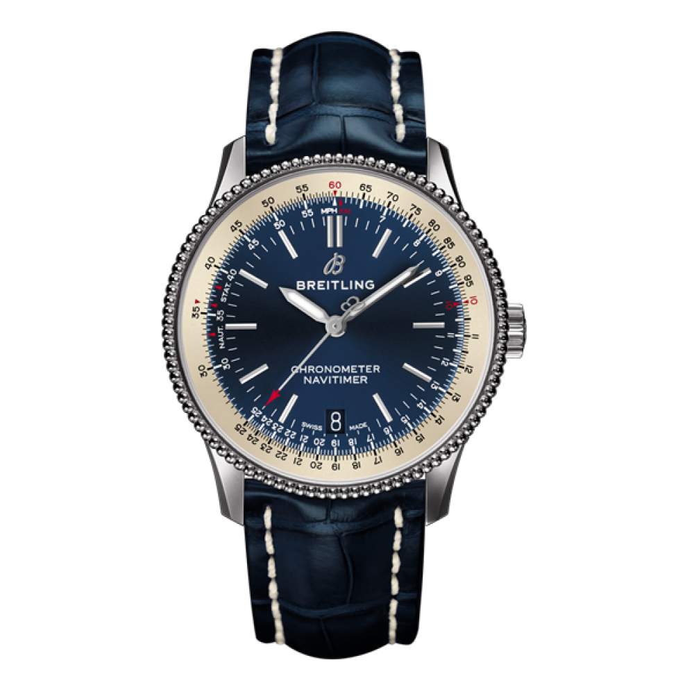 Breitling Navitimer Automatic 38 A17325241C1P1 - unisex watch produced by Breitling. It has Japanese automatic movement and Breitling Caliber 17 calibre. Stainless steel case of round shape. Case dimensions are 38 mm. in diameter. The dial of this Breitling watch is blue. Display type: analog. This timepiece has sapphire glass. Alligator band, band color: blue. 30 m. water resistance. The watch is from Navitimer collection. The following features are equipped: glowing hands, chronometer, slide rule, date.