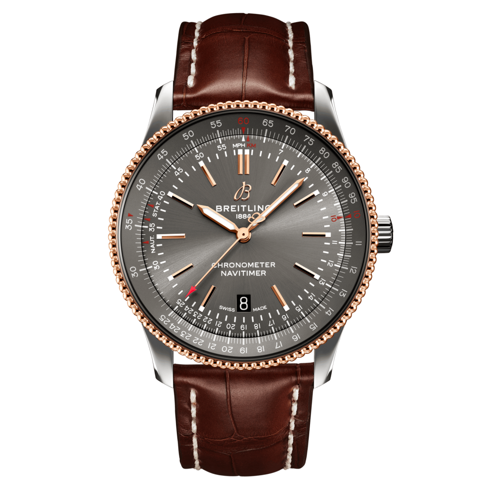 Breitling Navitimer Automatic 41 U17326121M1P1 - men's watch made by Breitling. It is equipped with Japanese automatic movement and Breitling Caliber 17 calibre. Stainless steel, 18k red gold case of round shape. Case dimensions are 41 mm. in diameter and 10 mm. in thickness. The dial of this Breitling watch is anthracite. Display type: analog. This timepiece has sapphire, antireflection coating glass. Alligator band, band color: brown. 30 m. water resistance. The watch is from Navitimer collection. The following features are equipped: glowing hands, chronometer, glowing markers, date.