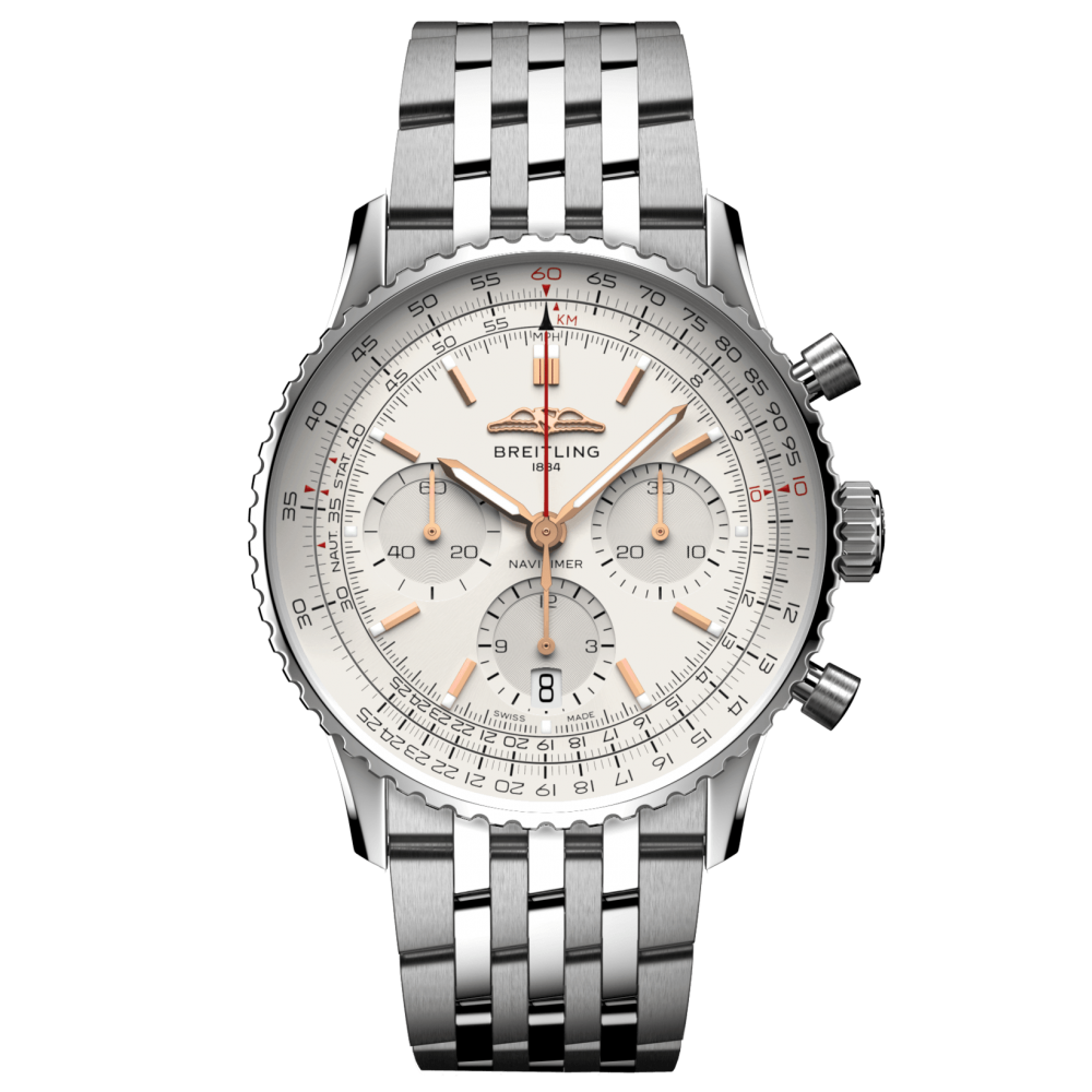 Breitling Navitimer B01 Chronograph 41 AB0139211G1A1 - men's watch manufactured by Breitling. It is equipped with Japanese automatic movement and Breitling Caliber 01 calibre. Stainless steel case of round shape. Case dimensions are 41 mm. in diameter and 13.6 mm. in thickness. The dial of this Breitling watch is silver. Display type: analog. This timepiece has sapphire, antireflection coating glass. Stainless steel band, band color: silver. 30 m. water resistance. The watch is from Navitimer collection. The following features are equipped: glowing hands, chronometer, glowing markers, chronograph, date.