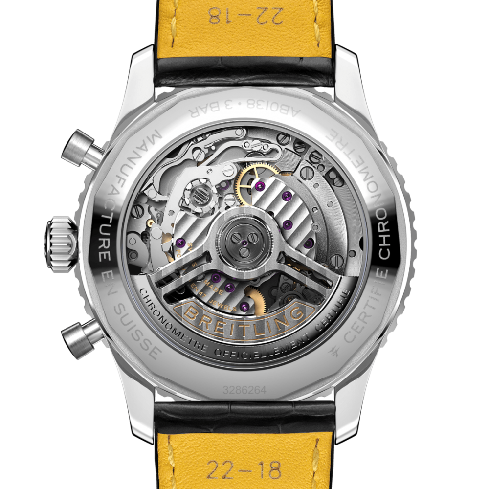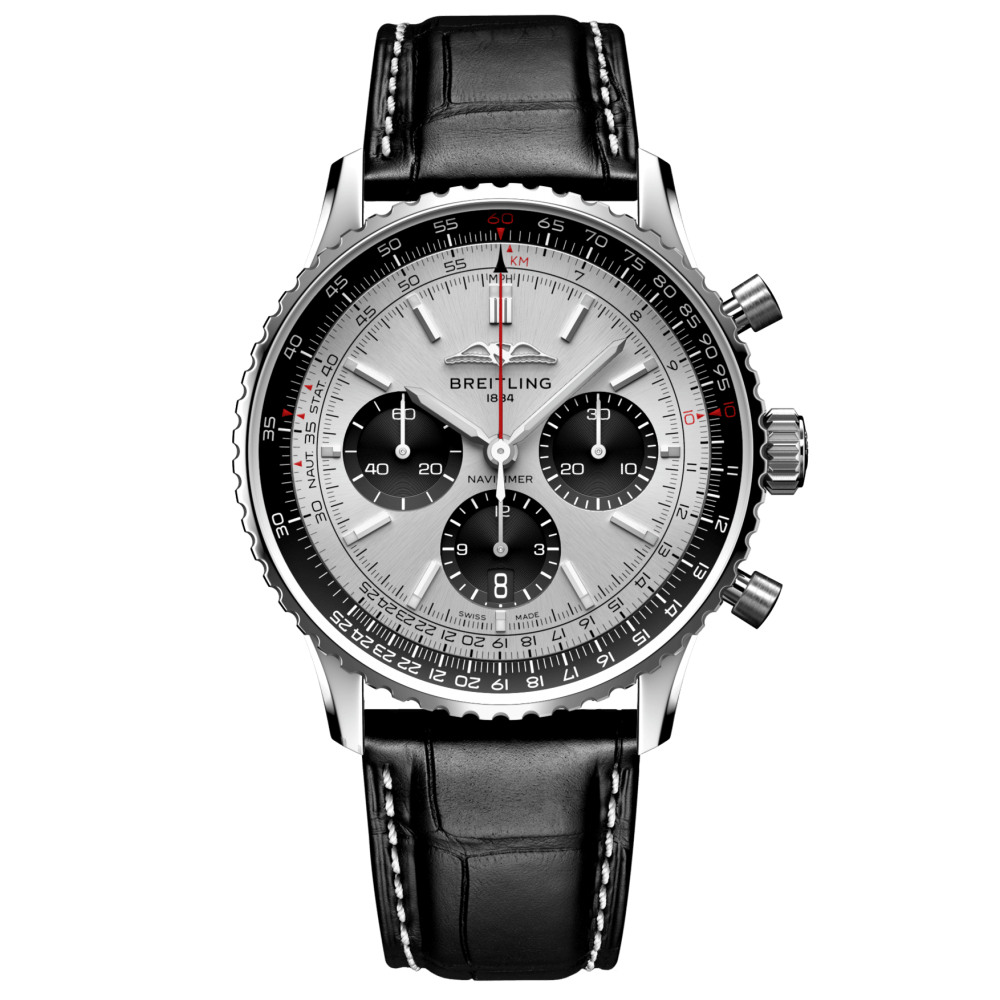 Breitling Navitimer B01 Chronograph 43 AB0138241G1P1 - men's watch produced by Breitling. It has Japanese automatic movement and Breitling Caliber 01 calibre. Stainless steel case of round shape. Case dimensions are 43 mm. in diameter and 13.6 mm. in thickness. The dial of this Breitling watch is silver. Display type: analog. This timepiece has sapphire, antireflection coating glass. Alligator band, band color: black. 30 m. water resistance. The watch is from Navitimer collection. The following features are equipped: date, glowing hands, glowing markers, chronograph.