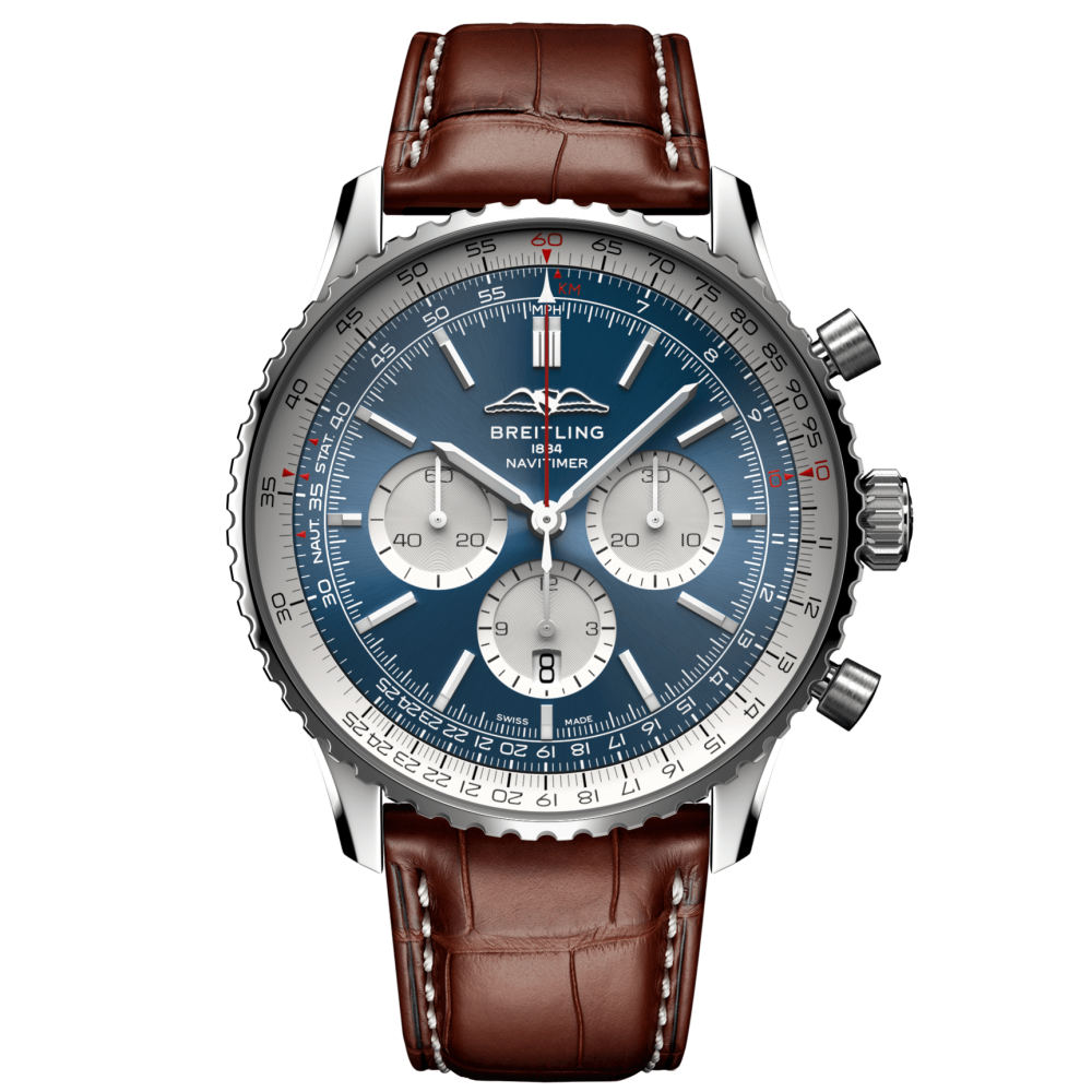 Breitling Navitimer B01 Chronograph 46 AB0137211C1P1 - men's watch produced by Breitling. It has Japanese automatic movement and Breitling Caliber 01 calibre. Stainless steel case of round shape. Case dimensions are 46 mm. in diameter and 13.9 mm. in thickness. The dial of this Breitling watch is blue. Display type: analog. This timepiece has sapphire, antireflection coating glass. Alligator band, band color: brown. 30 m. water resistance. The watch is from Navitimer collection. The following features are equipped: glowing hands, chronometer, glowing markers, chronograph, date, slide rule.