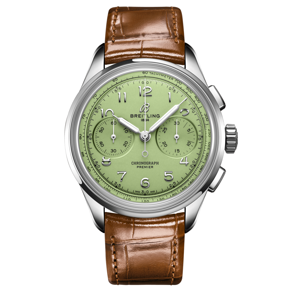 Breitling Premier B09 Chronograph 40 AB0930D31L1P1 - men's watch made by Breitling. It is equipped with Japanese hand wind movement and Breitling Caliber 09 calibre. Stainless steel case of round shape. Case dimensions are 40 mm. in diameter and 13 mm. in thickness. The dial of this Breitling watch is pistachio green. Display type: analog. This timepiece has sapphire, antireflection coating glass. Alligator band, band color: brown. 100 m. water resistance. The watch is from Premier collection. The following features are equipped: chronograph, chronometer, glowing hands.