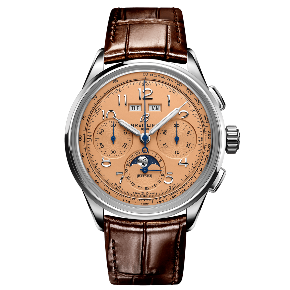 Breitling Premier B25 Datora 42 AB2510201K1P1 - men's watch manufactured by Breitling. It has Japanese automatic movement and Breitling Caliber 25 calibre. Stainless steel case of round shape. Case dimensions are 42 mm. in diameter and 15.3 mm. in thickness. The dial of this Breitling watch is copper. Display type: analog. This timepiece has sapphire, antireflection coating glass. Alligator band, band color: brown. 100 m. water resistance. The watch is from Premier collection. The following features are equipped: chronograph, chronometer, date, day, month, moon phase, glowing hands.