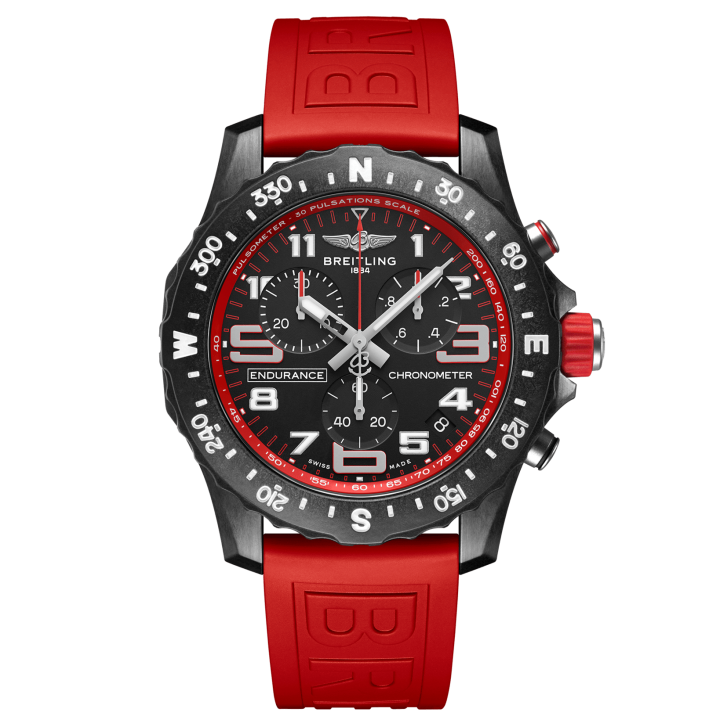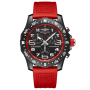 Breitling Professional Endurance Pro X82310D91B1S1 - men's watch made by Breitling. It is equipped with Japanese quartz movement and Breitling Caliber 82 calibre. Breitlight® case of round shape. Case dimensions are 44 mm. in diameter and 12.5 mm. in thickness. The dial of this Breitling watch is black. Display type: analog. This timepiece has sapphire, antireflection coating glass. Rubber band, band color: red. 100 m. water resistance. The watch is from Professional collection. The following features are equipped: chronometer, glowing hands, glowing markers, chronograph, date.
