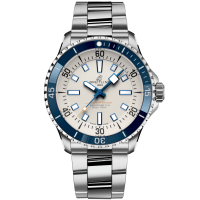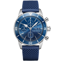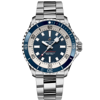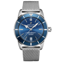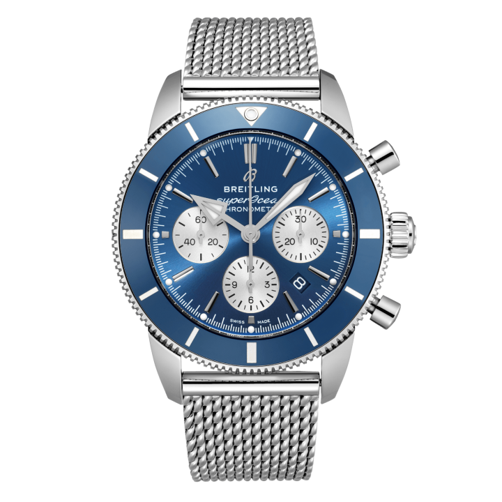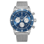 Breitling Superocean Heritage B01 Chronograph 44 AB0162161C1A1 - men's watch manufactured by Breitling. It is equipped with Japanese automatic movement and Breitling Caliber 01 calibre. Stainless steel, ceramic case of round shape. Case dimensions are 44 mm. in diameter and 15.5 mm. in thickness. The dial of this Breitling watch is blue. Display type: analog. This timepiece has sapphire, antireflection coating glass. Stainless steel band, band color: silver. 200 m. water resistance. The watch is from Superocean Heritage collection. The following features are equipped: chronometer, glowing hands, glowing markers, date, screw-down crown, chronograph.