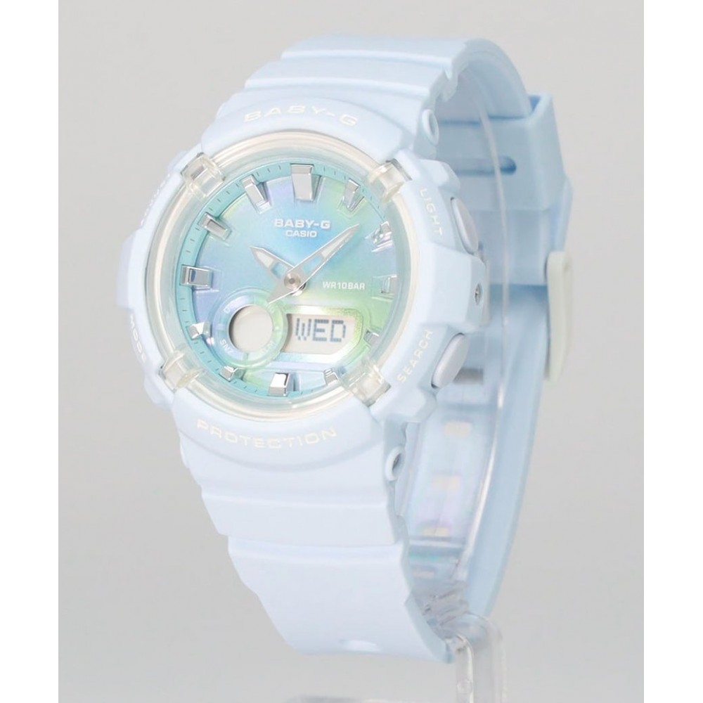 Casio Baby-G Analog-Digital BGA-280TD-2AJF - ladies watch manufactured by Casio. It is equipped with Japanese quartz movement and 5662 calibre. Resin case of round shape. Case dimensions are 43.4 mm. in diameter and 14.8 mm. in thickness. The dial of this Casio watch is lcd, blue. Display type: analog-digital. This timepiece has mineral glass. Resin band, band color: blue. 100 m. water resistance. The watch is from Baby-G collection. The following features are equipped: glowing hands, world time, countdown timer, backlight, perpetual calendar, date, day, month, chronograph, alarm.