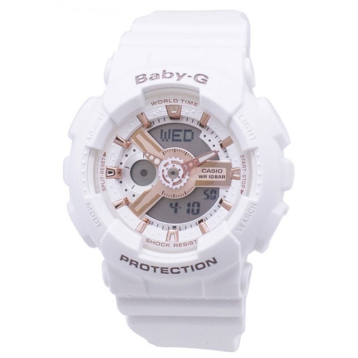 CASIO BABY-G BA-110RG-7AJF - ladies watch manufactured by Casio. It is equipped with Japanese quartz movement and 5338 calibre. Polymer case of round shape. Case dimensions are 43.4 mm. in diameter and 15.8 mm. in thickness. The dial of this Casio watch is white, lcd, gold. Display type: analog-digital. This timepiece has mineral glass. Polymer band, band color: white. 100 m. water resistance. The watch is from Baby-G collection. The following features are equipped: date, day, month, glowing hands, world time, chronograph, countdown timer, alarm, perpetual calendar, backlight.