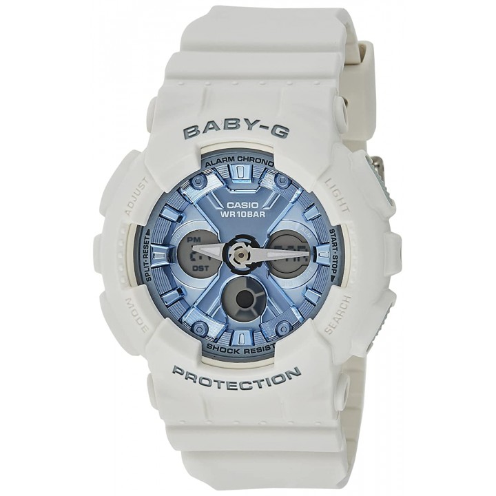 Casio Baby-G BA-130-7A2JF - ladies watch manufactured by Casio. It has Japanese quartz movement and 5607 calibre. Polymer case of round shape. Case dimensions are 43.3 mm. in diameter and 15.8 mm. in thickness. The dial of this Casio watch is lcd, blue. Display type: analog-digital. This timepiece has mineral glass. Polymer band, band color: white. 100 m. water resistance. The watch is from Baby-G collection. The following features are equipped: glowing hands, world time, chronograph, countdown timer, alarm, perpetual calendar, backlight, date, day, month.