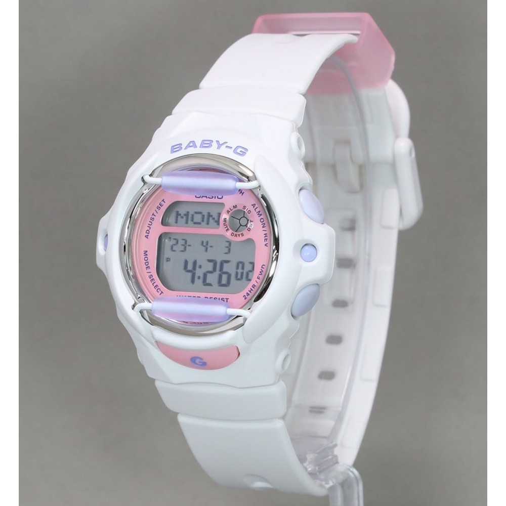 Casio Baby-G Basic BG-169PB-7JF - ladies watch produced by Casio. It has Japanese quartz movement and 3531 calibre. Resin, stainless steel case of round shape. Case dimensions are 42.6 mm. in diameter and 16.4 mm. in thickness. The dial of this Casio watch is lcd. Display type: digital. This timepiece has mineral glass. Resin band, band color: white. 200 m. water resistance. The watch is from Baby-G collection. The following features are equipped: world time, countdown timer, backlight, perpetual calendar, chronograph, alarm, date, day, month.