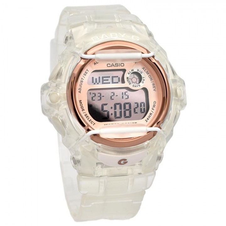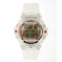 Casio Baby-G Basic BG-169UG-7BJF - ladies watch manufactured by Casio. It has Japanese quartz movement and 3531 calibre. Resin, stainless steel case of round shape. Case dimensions are 42.6 mm. in diameter and 16.4 mm. in thickness. The dial of this Casio watch is lcd, gold. Display type: digital. This timepiece has mineral glass. Resin band, band color: transparent. 200 m. water resistance. The watch is from Baby-G collection. The following features are equipped: world time, countdown timer, backlight, perpetual calendar, chronograph, alarm, date, day, month.