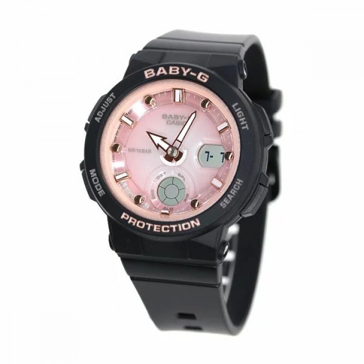 Casio Baby-G Beach Traveler Series BGA-250-1A3JF - ladies watch produced by Casio. It has Japanese quartz movement and 5570 calibre. Polymer case of round shape. Case dimensions are 41 mm. in diameter and 13.3 mm. in thickness. The dial of this Casio watch is lcd, pink. Display type: analog-digital. This timepiece has mineral glass. Polymer band, band color: black. 100 m. water resistance. The watch is from Baby-G collection. The following features are equipped: glowing hands, glowing markers, world time, chronograph, countdown timer, alarm, perpetual calendar, backlight, date, day, month.