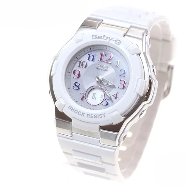 CASIO BABY-G BGA-1100GR-7BJF - ladies watch manufactured by Casio. It has Japanese solar quartz movement and 5133 calibre. Polymer, stainless steel case of round shape. Case dimensions are 39.8 mm. in diameter and 12.9 mm. in thickness. The dial of this Casio watch is gray, lcd. Display type: analog-digital. This timepiece has mineral glass. Polymer band, band color: white. 100 m. water resistance. The watch is from Baby-G collection. The following features are equipped: radio controlled, world time, chronograph, countdown timer, alarm, power reserve indicator, perpetual calendar, backlight, date, month.