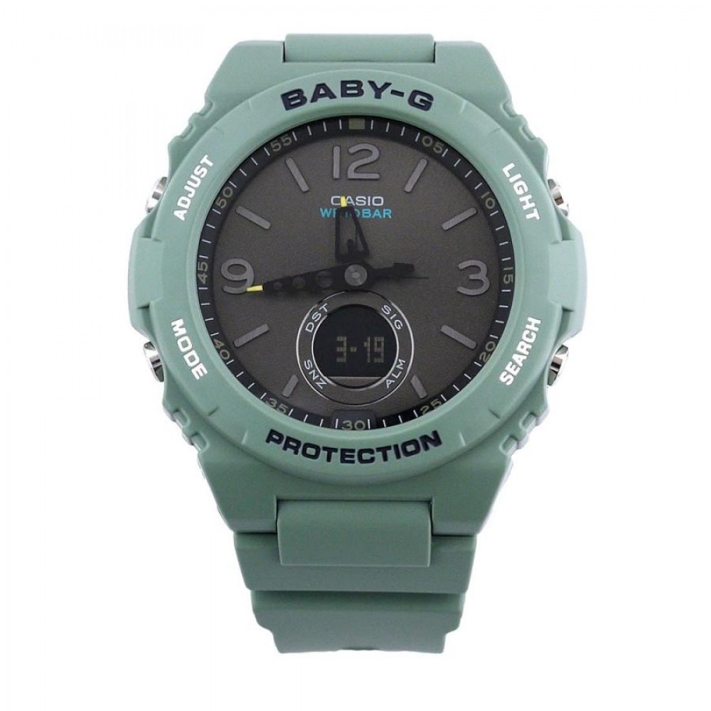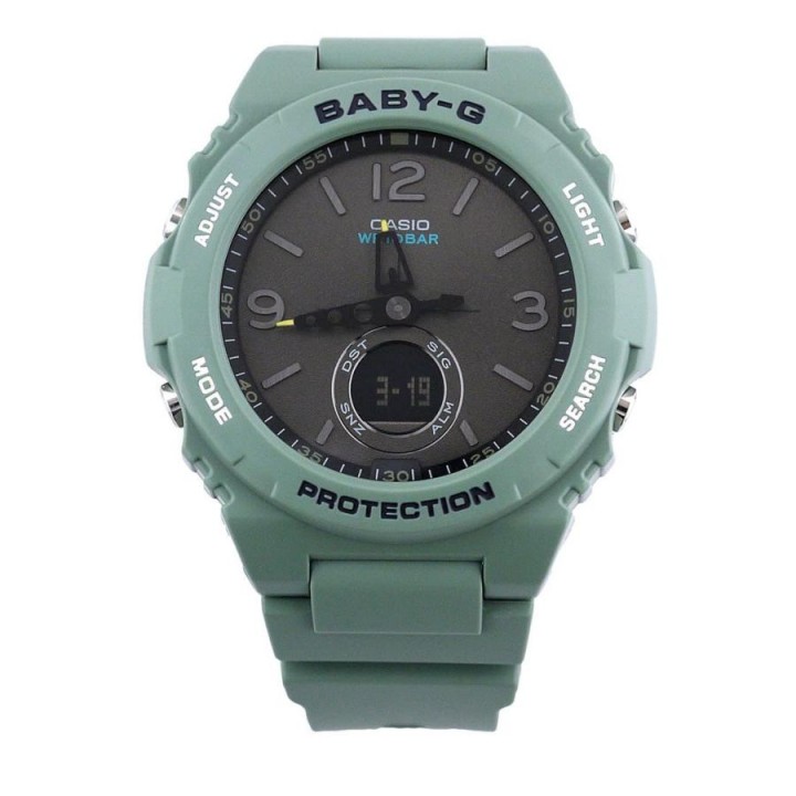 Casio Baby-G BGA-260-3AJF - ladies watch produced by Casio. It has Japanese quartz movement and 5628 calibre. Polymer case of round shape. Case dimensions are 42.4 mm. in diameter and 12.3 mm. in thickness. The dial of this Casio watch is lcd, gray. Display type: analog-digital. This timepiece has mineral glass. Polymer band, band color: green. 100 m. water resistance. The watch is from Baby-G collection. The following features are equipped: glowing hands, world time, chronograph, countdown timer, alarm, perpetual calendar, backlight, date, month, day.