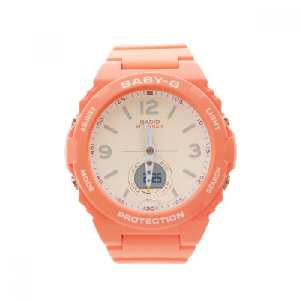 Casio Baby-G BGA-260-4AJF - ladies watch manufactured by Casio. It is equipped with Japanese quartz movement and 5628 calibre. Polymer case of round shape. Case dimensions are 42.4 mm. in diameter and 12.3 mm. in thickness. The dial of this Casio watch is lcd, beige. Display type: analog-digital. This timepiece has mineral glass. Polymer band, band color: orange. 100 m. water resistance. The watch is from Baby-G collection. The following features are equipped: glowing hands, world time, chronograph, countdown timer, alarm, perpetual calendar, backlight, date, month, day.