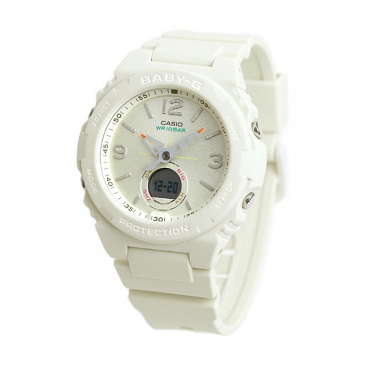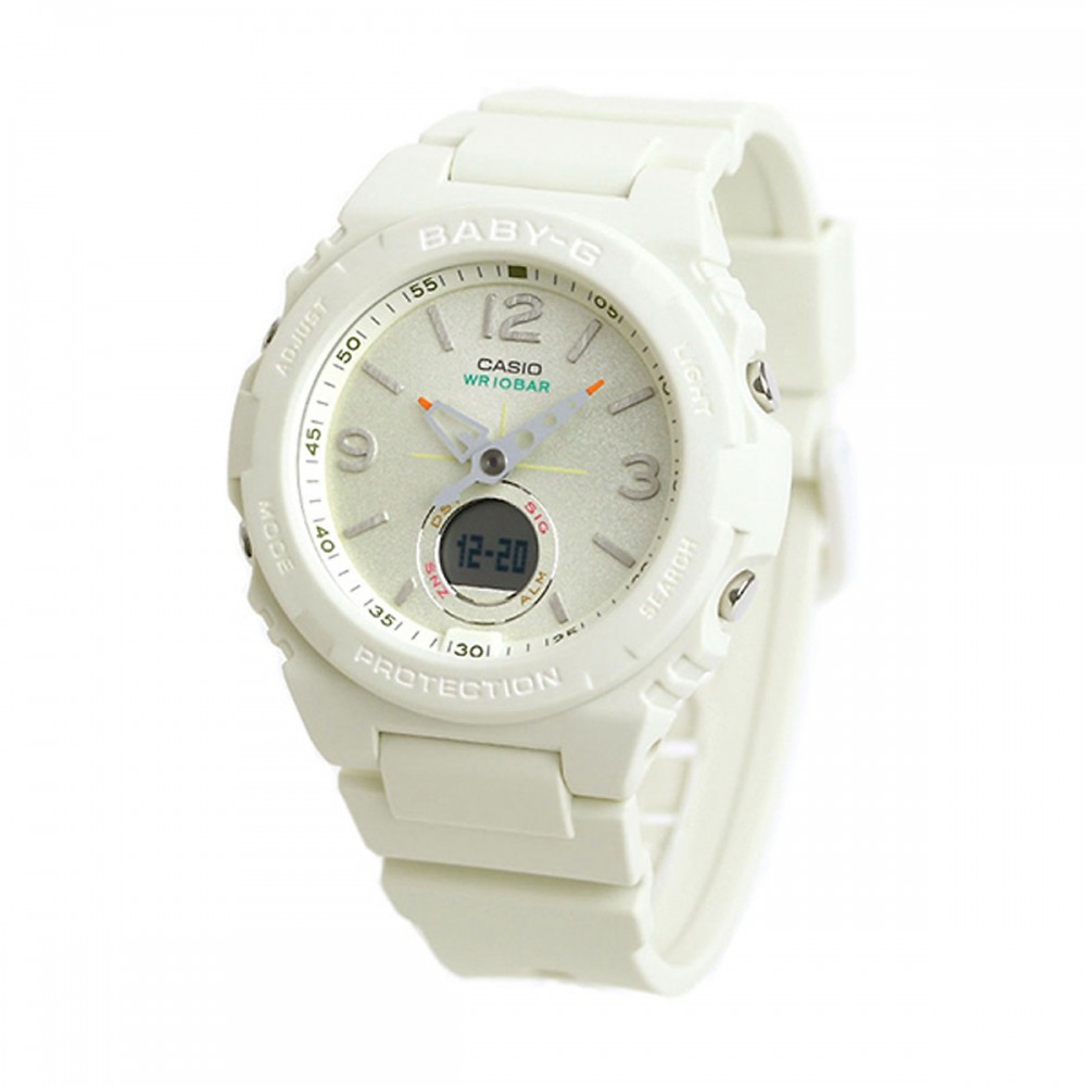 Casio Baby-G BGA-260-7AJF - ladies watch manufactured by Casio. It has Japanese quartz movement and 5628 calibre. Polymer case of round shape. Case dimensions are 42.4 mm. in diameter and 12.3 mm. in thickness. The dial of this Casio watch is lcd, beige. Display type: analog-digital. This timepiece has mineral glass. Polymer band, band color: beige. 100 m. water resistance. The watch is from Baby-G collection. The following features are equipped: glowing hands, world time, chronograph, countdown timer, alarm, perpetual calendar, backlight, date, month, day.