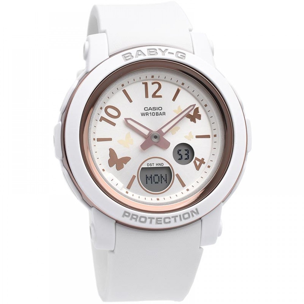 Casio Baby-G BGA-290BD-7AJF - ladies watch manufactured by Casio. It is equipped with Japanese quartz movement and 5670 calibre. Polymer case of round shape. Case dimensions are 41.5 mm. in diameter and 10.1 mm. in thickness. The dial of this Casio watch is lcd, silver. Display type: analog-digital. This timepiece has mineral glass. Polymer band, band color: white. 100 m. water resistance. The watch is from Baby-G collection. The following features are equipped: glowing hands, world time, countdown timer, backlight, perpetual calendar, chronograph, alarm, date, day, month.