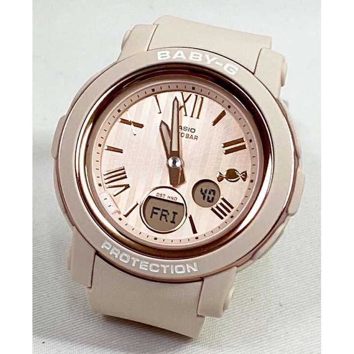 Casio Baby-G BGA-290SW-4AJF - ladies watch manufactured by Casio. It is equipped with Japanese quartz movement and 5670 calibre. Resin case of round shape. Case dimensions are 41.5 mm. in diameter and 10.1 mm. in thickness. The dial of this Casio watch is lcd, light pink. Display type: analog-digital. This timepiece has mineral glass. Resin band, band color: pink. 100 m. water resistance. The watch is from Baby-G collection. The following features are equipped: glowing hands, world time, countdown timer, backlight, perpetual calendar, chronograph, alarm, date, day, month.
