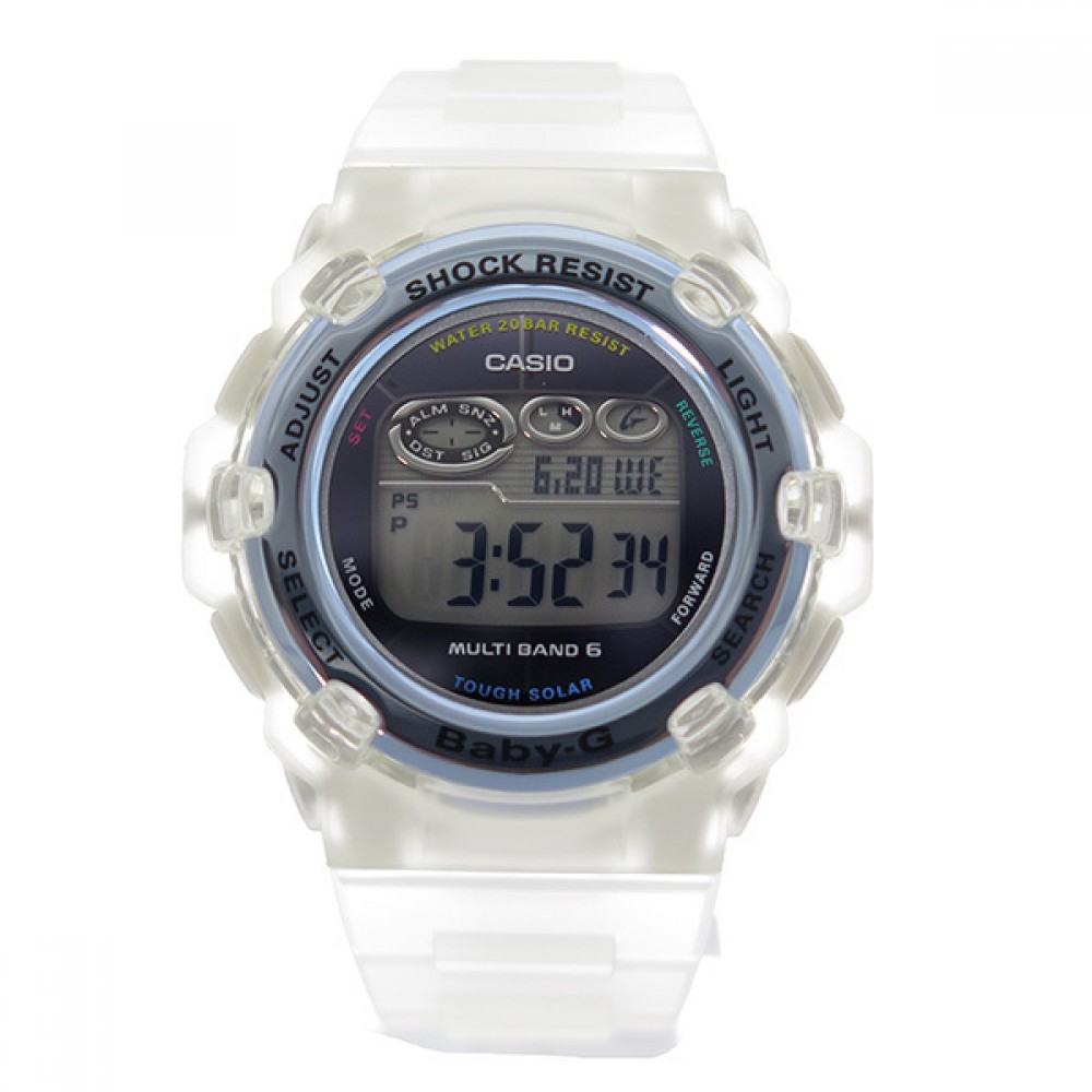 CASIO BABY-G BGR-3008K-7JR - ladies watch made by Casio. It is equipped with Japanese solar quartz movement and 3219 calibre. Polymer, aluminum case of round shape. Case dimensions are 40 mm. in diameter and 12.9 mm. in thickness. The dial of this Casio watch is lcd. Display type: digital. This timepiece has mineral glass. Polymer band, band color: gray. 200 m. water resistance. The watch is from Baby-G collection. The following features are equipped: radio controlled, perpetual calendar, world time, chronograph, countdown timer, date, day, alarm, backlight.