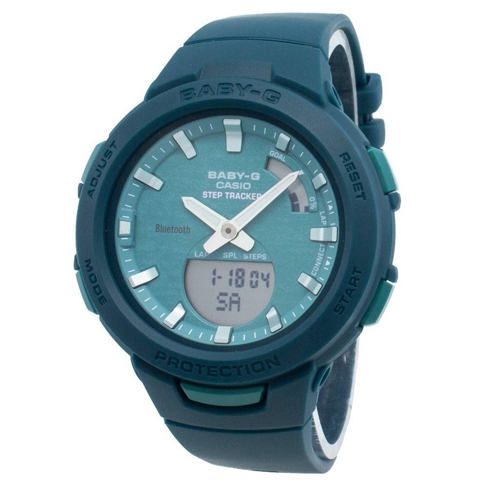 Casio Baby-G BSA-B100AC-3AJF - ladies watch made by Casio. It is equipped with Japanese quartz movement and 5556 calibre. Polymer case of round shape. Case dimensions are 41.4 mm. in diameter and 12.6 mm. in thickness. The dial of this Casio watch is lcd, green. Display type: analog-digital. This timepiece has mineral glass. Polymer band, band color: green. 100 m. water resistance. The watch is from Baby-G collection. The following features are equipped: glowing hands, bluetooth, dual time, chronograph, countdown timer, alarm, perpetual calendar, backlight, date, day, month.