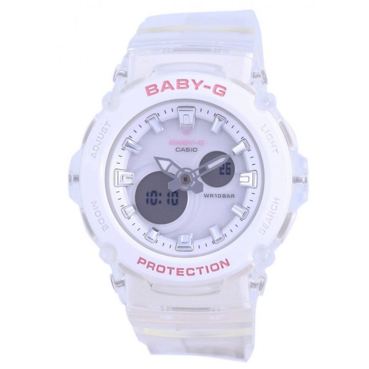 Casio Baby-G Color Skeleton Series BGA-270S-7AJF - ladies watch manufactured by Casio. It has Japanese quartz movement and 5629 calibre. Polymer case of round shape. Case dimensions are 42.2 mm. in diameter and 13.2 mm. in thickness. The dial of this Casio watch is lcd, white. Display type: analog-digital. This timepiece has mineral glass. Polymer band, band color: white. 100 m. water resistance. The watch is from Baby-G collection. The following features are equipped: glowing hands, world time, chronograph, countdown timer, alarm, perpetual calendar, backlight, date, day, month.