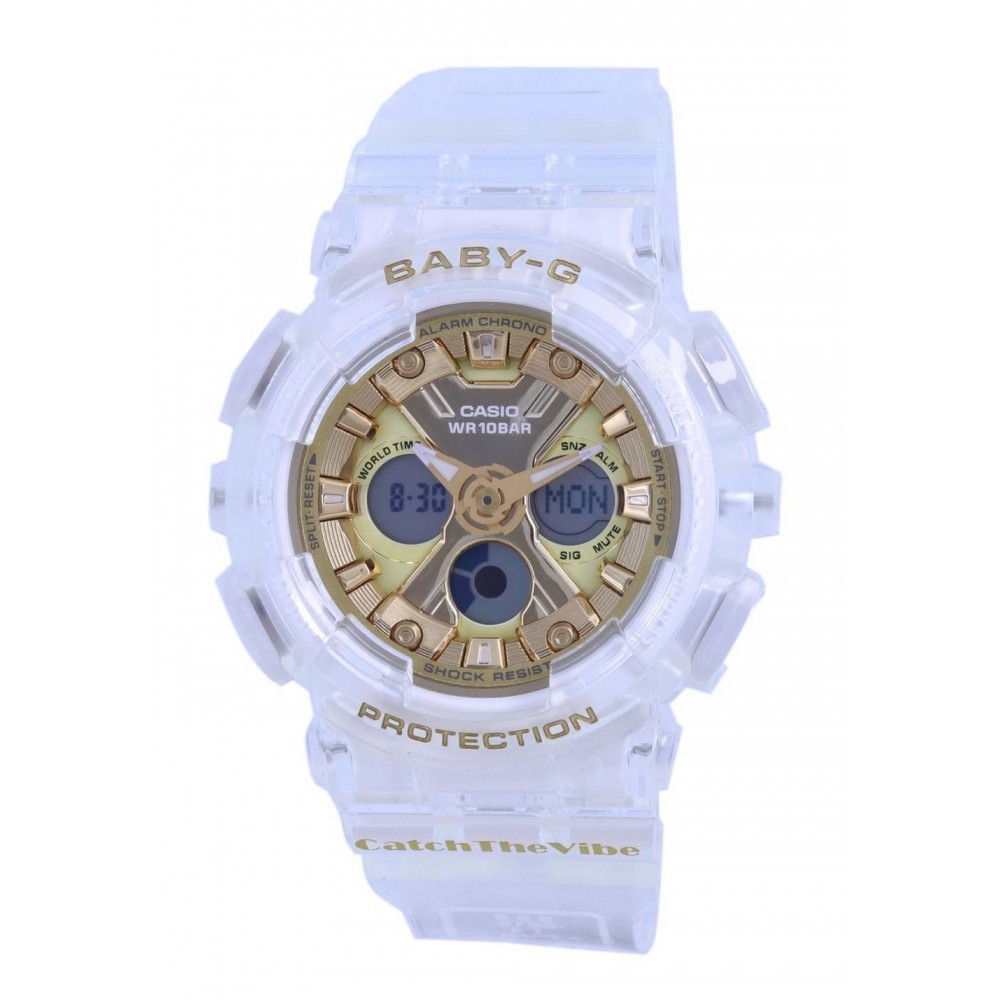 Casio Baby-G Dance Mode On BA-130CVG-7AJF - ladies watch made by Casio. It has Japanese quartz movement and 5607 calibre. Polymer case of round shape. Case dimensions are 43.3 mm. in diameter and 15.8 mm. in thickness. The dial of this Casio watch is lcd, gold. Display type: analog-digital. This timepiece has mineral glass. Polymer band, band color: clear. 100 m. water resistance. The watch is from Baby-G collection. The following features are equipped: glowing hands, world time, countdown timer, backlight, perpetual calendar, chronograph, alarm, day, date, month.