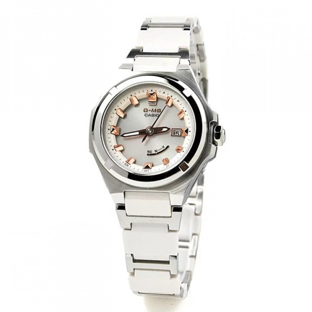 Casio Baby-G G-MS MSG-W300C-7AJF - ladies watch produced by Casio. It is equipped with Japanese solar quartz movement and 5592 calibre. Stainless steel, polymer case of round shape. Case dimensions are 34.4 mm. in diameter and 10.8 mm. in thickness. The dial of this Casio watch is silver. Display type: analog. This timepiece has mineral glass. Polymer, stainless steel band, band color: beige, silver. 100 m. water resistance. The watch is from Baby-G collection. The following features are equipped: glowing hands, screw-down crown, radio controlled, perpetual calendar, date.