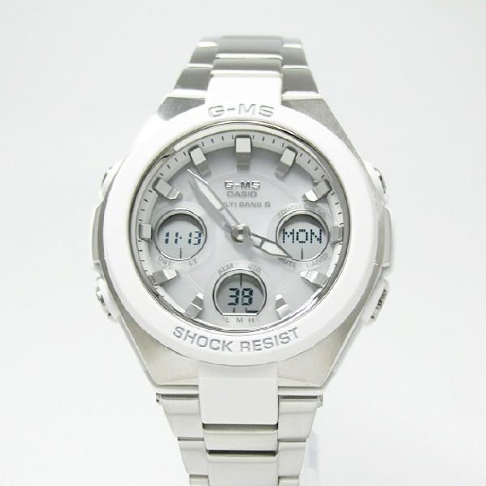 CASIO BABY-G G-MS MSG-W100D-7AJF - ladies watch manufactured by Casio. It has Japanese solar quartz movement and 5549 calibre. Polymer, stainless steel case of round shape. Case dimensions are 41 mm. in diameter and 13.1 mm. in thickness. The dial of this Casio watch is gray, lcd. Display type: analog-digital. This timepiece has mineral glass. Stainless steel band, band color: silver. 100 m. water resistance. The watch is from Baby-G collection. The following features are equipped: radio controlled, world time, chronograph, countdown timer, alarm, power reserve indicator, perpetual calendar, backlight, date, day, month.