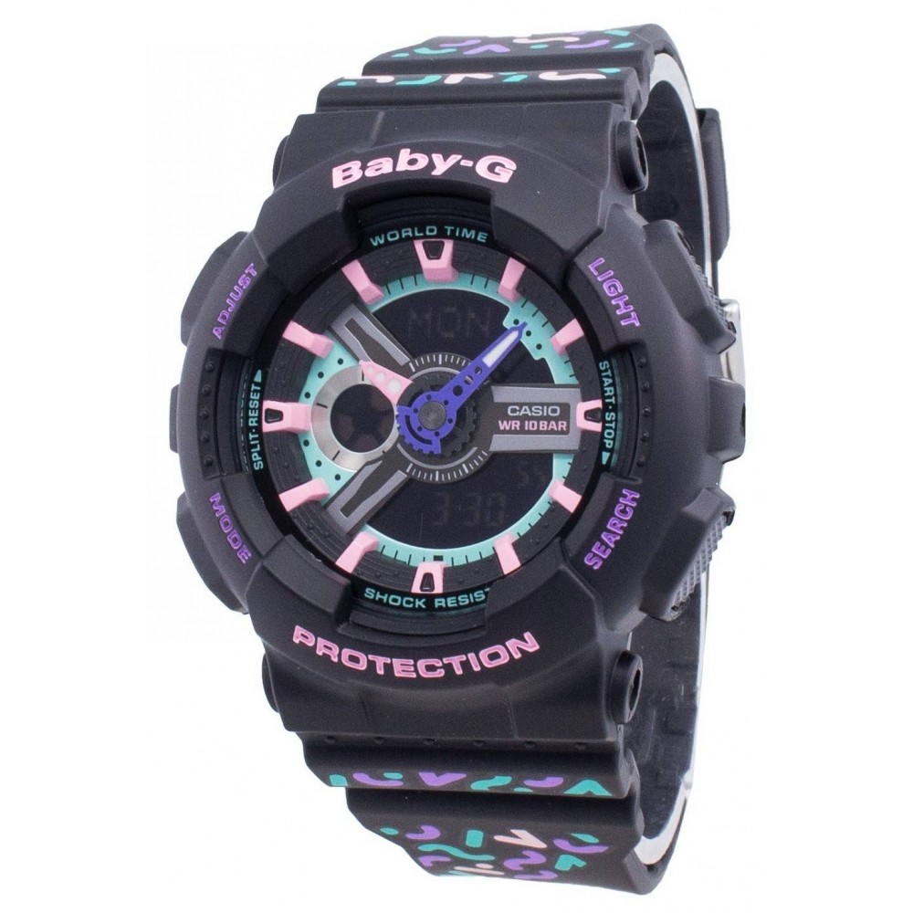 Casio Baby-G Geometric BA-110TH-1AJF - ladies watch produced by Casio. It is equipped with Japanese quartz movement and 5338 calibre. Polymer case of round shape. Case dimensions are 43.4 mm. in diameter and 15.8 mm. in thickness. The dial of this Casio watch is lcd, black, purple. Display type: analog-digital. This timepiece has mineral glass. Polymer band, band color: black. 100 m. water resistance. The watch is from Baby-G collection. The following features are equipped: glowing hands, world time, chronograph, countdown timer, alarm, perpetual calendar, backlight, date, day, month.