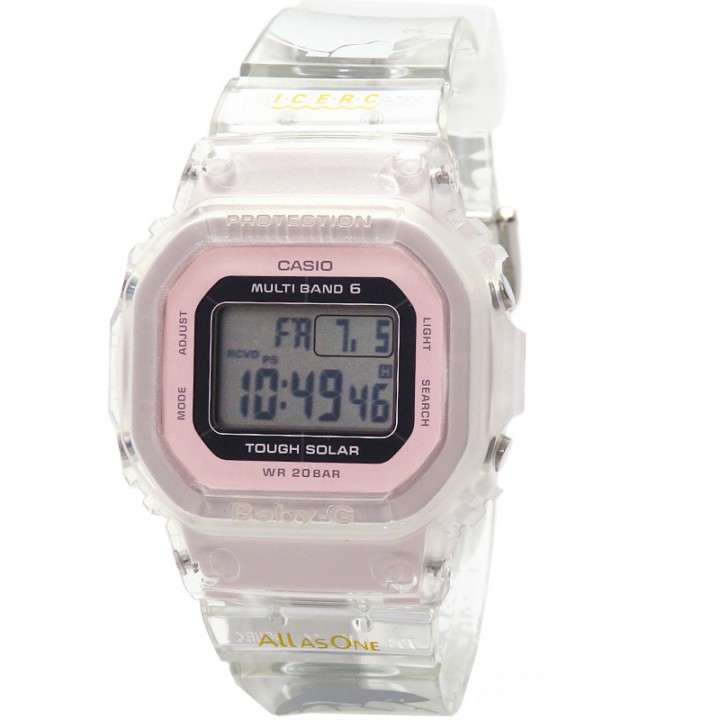Casio Baby-G Love The Sea And The Earth 25th ANNIVERSARY BGD-5001K-7JR - ladies watch manufactured by Casio. It has Japanese solar quartz movement and 3432 calibre. Polymer case of polygon shape. Case dimensions are 40 mm. in diameter and 12.5 mm. in thickness. The dial of this Casio watch is lcd, pink. Display type: digital. This timepiece has mineral glass. Polymer band, band color: gray. 200 m. water resistance. The watch is from Baby-G collection. The following features are equipped: radio controlled, world time, chronograph, countdown timer, alarm, power reserve indicator, perpetual calendar, backlight, date, day, month.