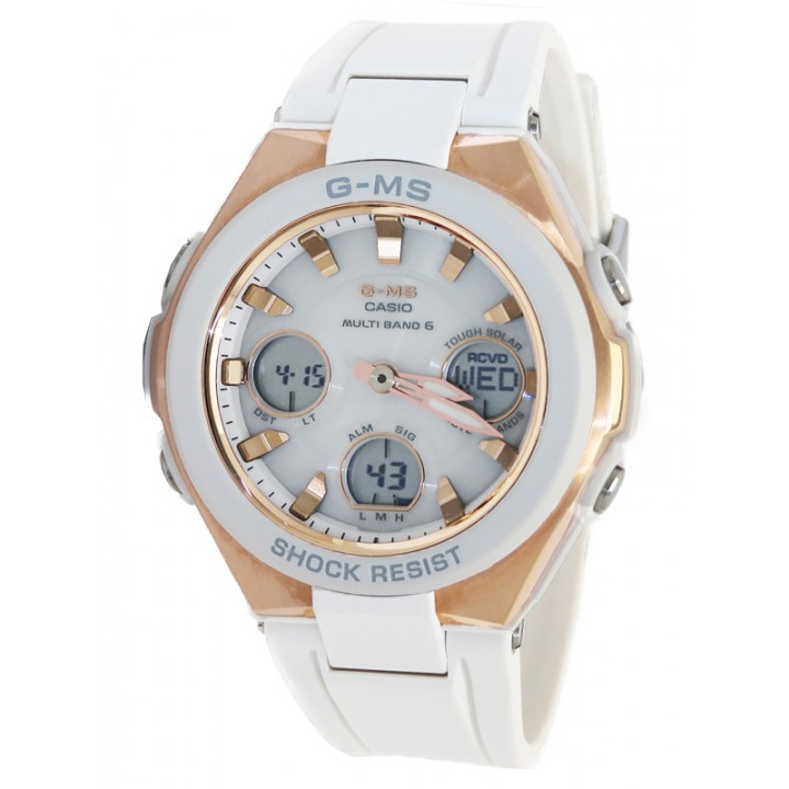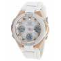 CASIO BABY-G MSG-W100G-7AJF - ladies watch produced by Casio. It is equipped with Japanese solar quartz movement and 5549 calibre. Polymer, stainless steel, gold plated case of round shape. Case dimensions are 41 mm. in diameter and 13.1 mm. in thickness. The dial of this Casio watch is gray, lcd. Display type: analog-digital. This timepiece has mineral glass. Polymer band, band color: white. 100 m. water resistance. The watch is from Baby-G collection. The following features are equipped: radio controlled, world time, chronograph, countdown timer, alarm, power reserve indicator, perpetual calendar, backlight, date, day, month.