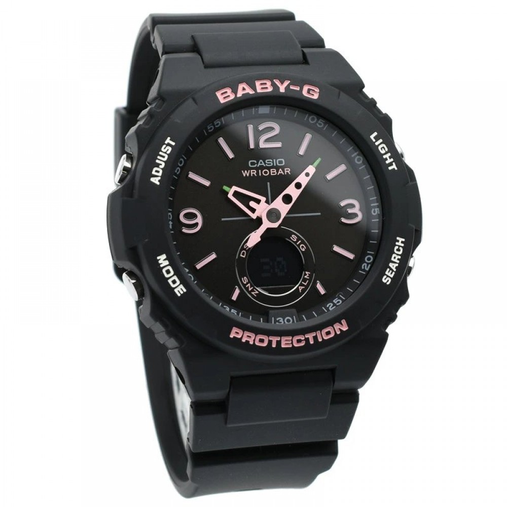 Casio Baby-G Spring Outdoor Colors BGA-260SC-1AJF - ladies watch made by Casio. It is equipped with Japanese quartz movement and 5628 calibre. Polymer case of round shape. Case dimensions are 42.4 mm. in diameter and 12.3 mm. in thickness. The dial of this Casio watch is lcd, black. Display type: analog-digital. This timepiece has mineral glass. Polymer band, band color: black. 100 m. water resistance. The watch is from Baby-G collection. The following features are equipped: chronograph, countdown timer, alarm, perpetual calendar, backlight, date, day, month, world time.
