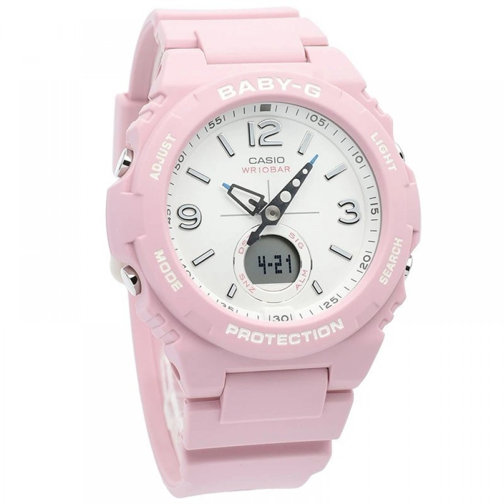 Casio Baby-G Spring Outdoor Colors BGA-260SC-4AJF - ladies watch produced by Casio. It has Japanese quartz movement and 5628 calibre. Polymer case of round shape. Case dimensions are 42.4 mm. in diameter and 12.3 mm. in thickness. The dial of this Casio watch is lcd, silver. Display type: analog-digital. This timepiece has mineral glass. Polymer band, band color: pink. 100 m. water resistance. The watch is from Baby-G collection. The following features are equipped: chronograph, countdown timer, alarm, perpetual calendar, backlight, date, day, month, world time.