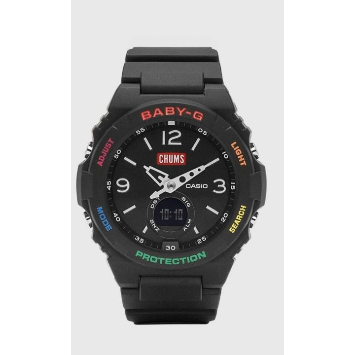 Casio Baby-G Team CHUMS Collaboration Limited Model BGA-260CH-1AJR - ladies watch made by Casio. It has Japanese quartz movement and 5628 calibre. Polymer case of round shape. Case dimensions are 42.4 mm. in diameter and 12.3 mm. in thickness. The dial of this Casio watch is lcd, black. Display type: analog-digital. This timepiece has mineral glass. Polymer band, band color: black. 100 m. water resistance. The watch is from Baby-G collection. The following features are equipped: world time, chronograph, countdown timer, alarm, perpetual calendar, backlight, glowing hands, glowing markers, date, day, month.
