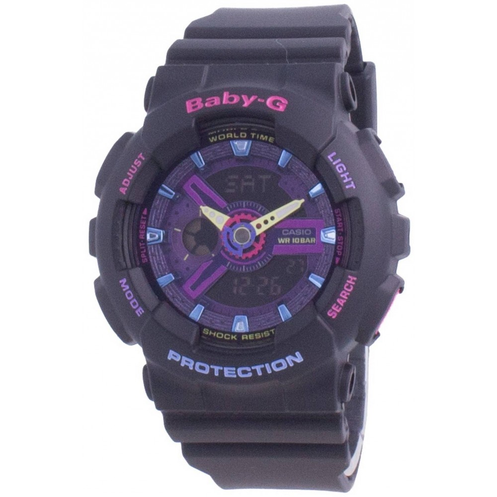 Casio Baby-G Tokyo Multicolor BA-110TM-1AJF - ladies watch produced by Casio. It has Japanese quartz movement and 5338 calibre. Polymer case of round shape. Case dimensions are 43.4 mm. in diameter and 15.8 mm. in thickness. The dial of this Casio watch is lcd, purple. Display type: analog-digital. This timepiece has mineral glass. Polymer band, band color: black. 100 m. water resistance. The watch is from Baby-G collection. The following features are equipped: glowing hands, world time, chronograph, countdown timer, alarm, perpetual calendar, backlight, date, day, month.