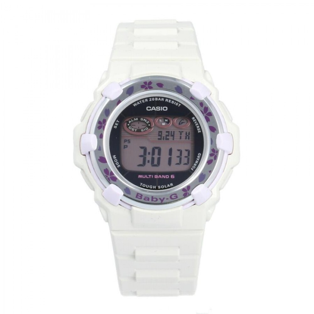 Casio Cherry Blossom Colors BGR-3000CBP-7JF - ladies watch made by Casio. It is equipped with Japanese solar quartz movement and 3219 calibre. Polymer, aluminum case of round shape. Case dimensions are 40 mm. in diameter and 12.9 mm. in thickness. The dial of this Casio watch is lcd. Display type: digital. This timepiece has mineral glass. Polymer band, band color: white. 200 m. water resistance. The watch is from Baby-G collection. The following features are equipped: radio controlled, world time, chronograph, countdown timer, alarm, power reserve indicator, perpetual calendar, backlight, date, day, month.