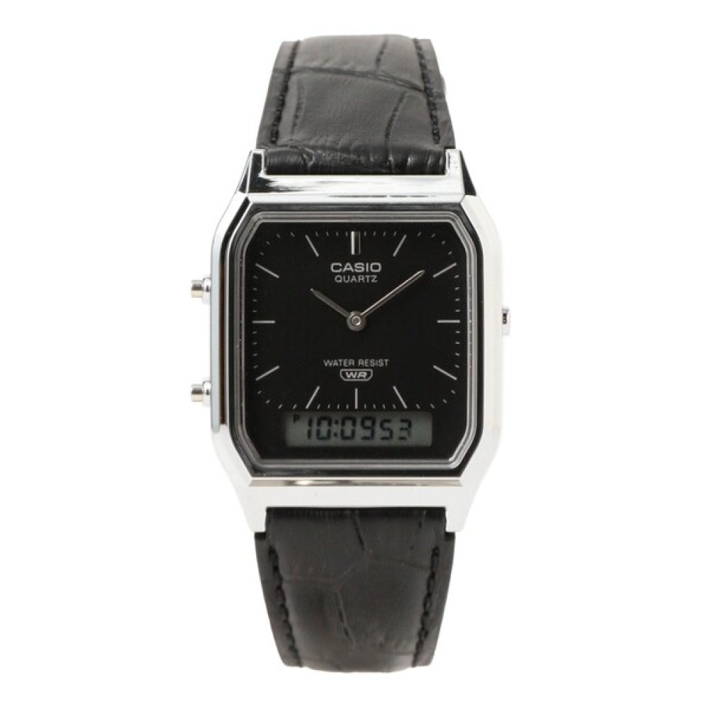 Casio Classic AQ-230EL-1AJF - unisex watch produced by Casio. It is equipped with Japanese quartz movement and 5154 calibre. Resin case of rectangle shape. Case dimensions are 29.8 mm. in diameter and 8.1 mm. in thickness. The dial of this Casio watch is lcd, black. Display type: analog-digital. This timepiece has resin glass. Genuine leather band, band color: black. 30 m. water resistance. The watch is from Classic collection. The following features are equipped: dual time, alarm, chronograph, perpetual calendar, date, day, month.