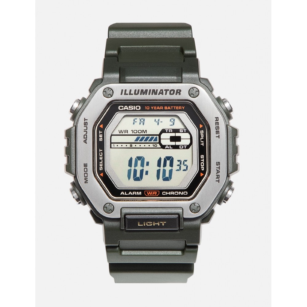Casio Collection Sports MWD-110H-3AJF - men's watch produced by Casio. It is equipped with Japanese quartz movement and 3517 calibre. Resin, stainless steel case of rectangle shape. Case dimensions are 47.2 mm. in diameter and 12.3 mm. in thickness. The dial of this Casio watch is lcd. Display type: digital. This timepiece has polymer glass. Resin band, band color: khaki. 100 m. water resistance. The watch is from Casio Standard Digital collection. The following features are equipped: dual time, countdown timer, backlight, perpetual calendar, chronograph, alarm, date, day, month.
