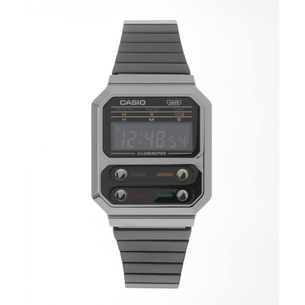 Casio Digital F-100 Alien Reprint Limited Model A100WEGG-1AJF - unisex watch manufactured by Casio. It is equipped with Japanese quartz movement and 3503 calibre. Polymer case of rectangle shape. Case dimensions are 32.7 mm. in diameter and 9.2 mm. in thickness. The dial of this Casio watch is lcd. Display type: digital. This timepiece has polymer glass. Stainless steel, hard coating band, band color: black. 30 m. water resistance. The watch is from Casio Standard Digital collection. The following features are equipped: alarm, chronograph, perpetual calendar, backlight, date, day, month, limited edition.