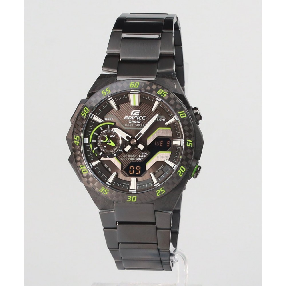 Casio Edifice Windflow ECB-2200YRC-1A3JF - men's watch manufactured by Casio. It has Japanese solar quartz movement and 5710 calibre. Stainless steel, ip coating, carbon case of round shape. Case dimensions are 48.2 mm. in diameter and 11.9 mm. in thickness. The dial of this Casio watch is lcd, black. Display type: analog-digital. This timepiece has sapphire, antireflection coating glass. Stainless steel, ip coating band, band color: black. 100 m. water resistance. The watch is from Edifice collection. The following features are equipped: bluetooth, glowing hands, glowing markers, world time, countdown timer, backlight, perpetual calendar, date, day, chronograph, alarm, power reserve indicator.