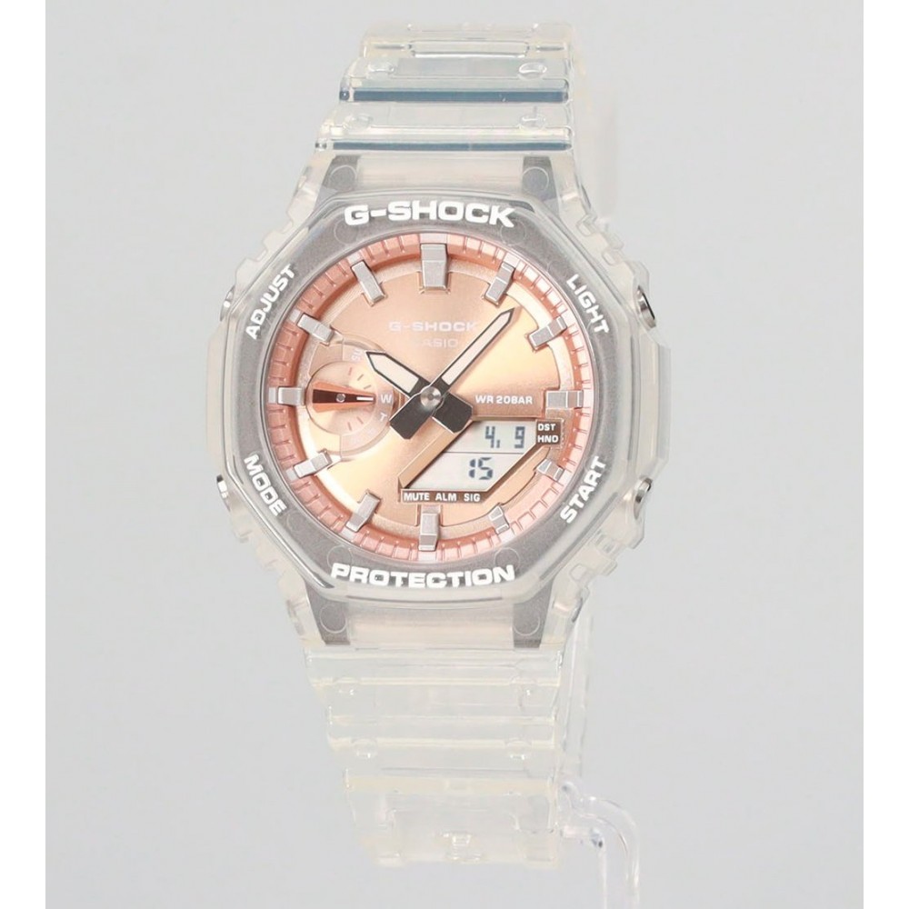 Casio G-Shock Analog-Digital GA-2100BM-7A5JF - men's watch manufactured by Casio. It has Japanese quartz movement and 5611 calibre. Resin, carbon case of round shape. Case dimensions are 45.4 mm. in diameter and 11.8 mm. in thickness. The dial of this Casio watch is lcd, brown. Display type: analog-digital. This timepiece has mineral glass. Resin band, band color: clear. 200 m. water resistance. The watch is from G-Shock collection. The following features are equipped: glowing hands, world time, countdown timer, backlight, perpetual calendar, chronograph, date, day, alarm, month.
