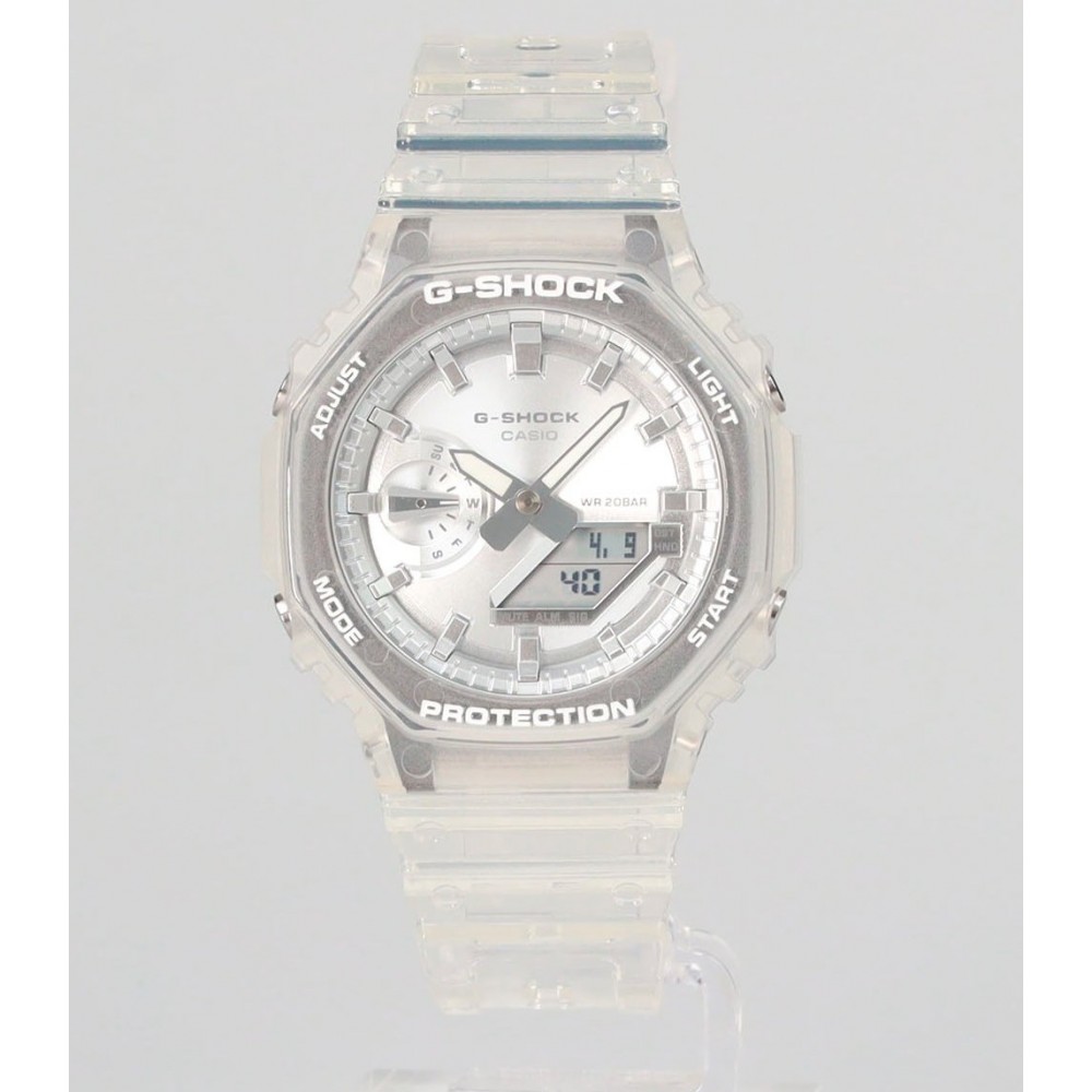 Casio G-Shock Analog-Digital GA-2100BM-7A8JF - men's watch produced by Casio. It has Japanese quartz movement and 5611 calibre. Resin, carbon case of round shape. Case dimensions are 45.4 mm. in diameter and 11.8 mm. in thickness. The dial of this Casio watch is lcd, silver. Display type: analog-digital. This timepiece has mineral glass. Resin band, band color: clear. 200 m. water resistance. The watch is from G-Shock collection. The following features are equipped: glowing hands, world time, countdown timer, backlight, perpetual calendar, chronograph, date, day, alarm, month.
