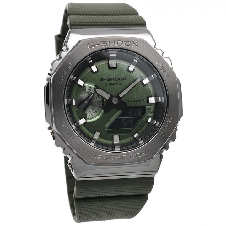 Casio G-Shock Analog-Digital GM-2100B-3AJF - men's watch produced by Casio. It has Japanese quartz movement and 5611 calibre. Stainless steel, polymer, hard coating case of round shape. Case dimensions are 44.4 mm. in diameter and 11.8 mm. in thickness. The dial of this Casio watch is lcd, khaki. Display type: analog-digital. This timepiece has mineral glass. Polymer band, band color: khaki. 200 m. water resistance. The watch is from G-Shock collection. The following features are equipped: glowing hands, glowing markers, world time, countdown timer, backlight, perpetual calendar, chronograph, alarm, date, day, month.