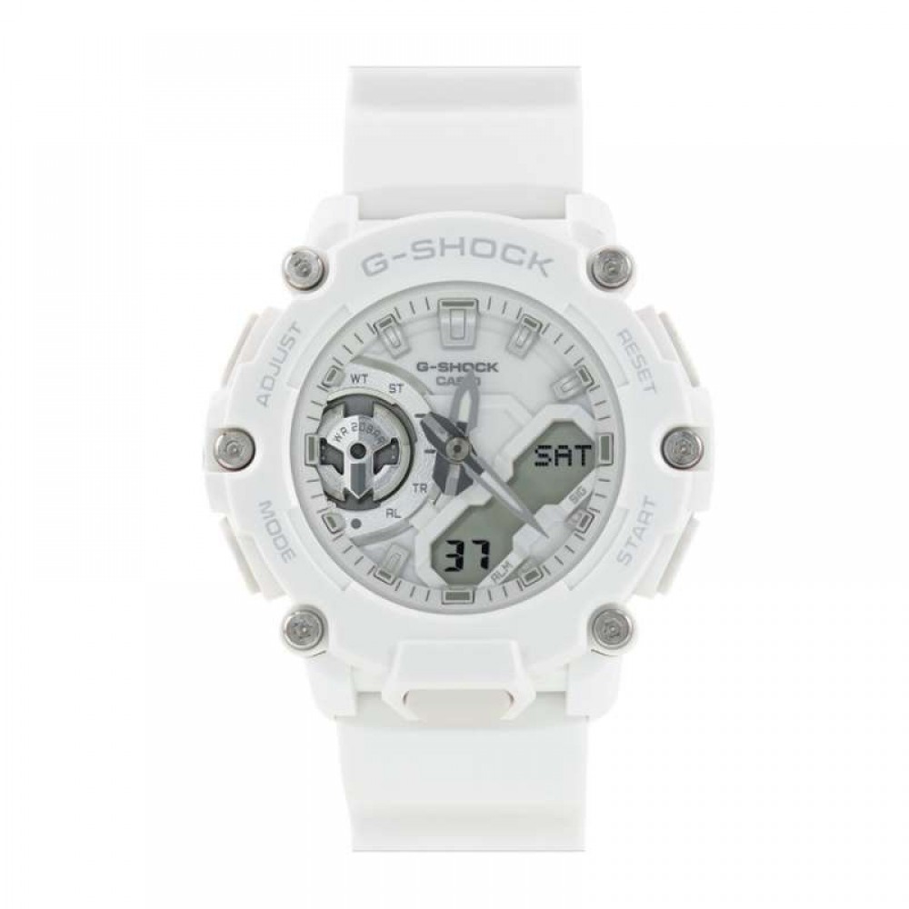 Casio G-Shock Analog-Digital GMA-S2200M-7AJF - men's watch produced by Casio. It is equipped with Japanese quartz movement and 5694 calibre. Polymer, carbon case of round shape. Case dimensions are 45.7 mm. in diameter and 12.1 mm. in thickness. The dial of this Casio watch is lcd, white. Display type: analog-digital. This timepiece has mineral glass. Polymer band, band color: white. 200 m. water resistance. The watch is from G-Shock collection. The following features are equipped: glowing hands, world time, countdown timer, backlight, perpetual calendar, chronograph, alarm, date, day, month.